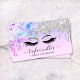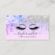 Ce magnifique design carte de visite de cils et sourcils présente une parties scintillant faux argent gouttant, des fleurs violettes et bleues, des cils et une police de calligraphie élégante.