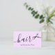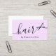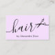 Ce design carte de visite de coiffure moderne présente des ciseaux noirs, des arrière - plans pastel violet et une police de calligraphie élégante.