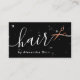 Ce design carte de visite de coiffure moderne présente des ciseaux d'or rose en faux cuivre, un arrière - plan en marbre noir et une police de calligraphie élégante.