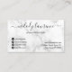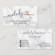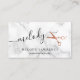 Cartes de visite modernes et élégants pour coiffeurs avec ciseaux d'or rose en faux cuivre, arrière - plan en marbre blanc et police de calligraphie élégante.