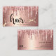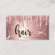 Ce magnifique design carte de visite de coiffure styliste dispose de faux rose de cuivre or goutte parties scintillant texture métallique, ciseaux d'or et élégante police calligraphie.