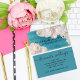 Bel et élégant design carte de visite personnalisé avec fleurs Peony blanches sur un motif damassé turquoise et en mauvais état. Le texte est entièrement personnalisable.