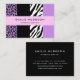 Cartes de visite élégants, élégants et sophistiqués avec motif léopard et zèbre de couleur violette. Design moderne et tendance, parfait pour les amateurs de poster de animal.