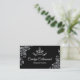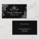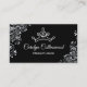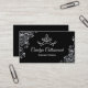 Carte de visite de concours de glam en noir, avec des fleurs blanches et une couronne stylisée en blanc. Personnalisez tout le texte pour votre entreprise de concours.