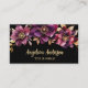 Elégant violet doré Carte de visite floral noir. Le front a votre nom dans un script doré et votre titre ou nom de société sous. 3 fleurs et feuilles en violet et or sur un arrière - plan noir et sophistiqué encadre la carte dans une arche. Le dos a l'essentiel sur le côté gauche comme; nom, titre ou nom de l'entreprise, adresse, téléphone, web et courrier. Le côté droit haie les fleurs en violet et doré. Un cadre doré le finalise. Ce carte de visite est féminin et délicat pour différents métiers.