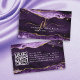 Carte de visite professionnel moderne et élégant avec QR Code avec géode agate violet, veines de parties scintillant en marbre et faux or et accents pétillants personnalisés avec des initiales monogrammes de style signature fantaisie avec des swashes. MODIFICATIONS : Modifiez le style, la couleur, la taille et le placement de la police de texte dans EDIT. ASSISTANCE : Pour obtenir de l'aide sur la modification ou la personnalisation de la conception ou pour coordonner des éléments, contactez le concepteur AVANT LA COMMANDE via l'onglet MESSAGE Conversation Zazzle ou envoyez un courriel à makeitaboutyoustore@gmail.com.