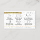 Assurez-vous que vos clients savent comment prendre soin de leurs extensions weft ou ruban avec un carte de visite personnalisé d'instructions de postsoins après-cheveux. Cette carte de soin salon de coiffure glam blanc et or comprend des icônes et des conseils de soin pour les extensions de cheveux (peut être utilisé pour les cheveux naturels ou faux cheveux), des polices d'effet or moderne et de l'espace pour vos détails d'affaires. Ce guide de soins pour extensions de cheveux en faux or élégant est l'ajout parfait à votre salon de coiffure ou à votre papeterie design.