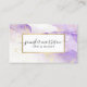 Ce carte de visite créatif est doté d'un arrière - plan d'aquarelle violet lavande douce aux reflets de poussière d'or pour un design chic et abstrait. Personnalisez le texte élégant du script avec votre nom ou nom d'entreprise. Cette carte recto verso offre un grand espace à l'arrière pour vos coordonnées et vos médias sociaux. Art et design originaux © 1201AM Design Studio | www.1201am.com