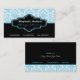 Carte de visite aux intérieurs noirs turquoise blanc damassé, aux motifs turquoise et blanc damassé. La partie inférieure est de couleur noire solide. Une bande noire et une bande turquoise séparent les deux parties. Votre entreprise/nom est tapé sur un élégant étiquette noir aux contours blanc et turquoise.
