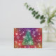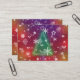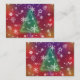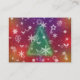 Une dispersion de flocons de neige blancs, de feuilles saints et de baies, d'étoiles et de pins contre un arrière - plan brillant de rouge, d'orange, d'or et de violet, avec au milieu un doux arbre de Noël vert.