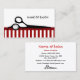 Écartez le mot au sujet de votre nouveau salon chic de salon de coiffure et de beauté avec ces cartes de visite rayés rouges et noirs élégants et à la mode de mode avec une paire de cisaillements de coupe de cheveux noirs embellis avec une boucle des cheveux. Personnalisez ces cartes modernes de salon de beauté en ajoutant le nom du coiffeur.