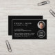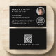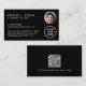 Carte de visite professionnel noir simple avec votre photo présentée dans un cadre circulaire, le logo de votre entreprise et votre nom, titre et coordonnées (tels que courriel, numéros de téléphone, nom de l'entreprise et adresse postale) en lettres blanches propres et modernes. À l'arrière, entrez une adresse URL pour créer un code QR numérisable lié à votre site Web, profils de médias sociaux ou toute autre plate-forme qui présente votre travail, ce qui permet aux autres d'explorer facilement votre expertise, et d'ajouter du texte ou de laisser vide.