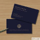 Faites une impression durable avec nos Cartes de visite Bleus de marine professionnelle avec Logo Gold Personnalisé avec typographie classique sur un arrière - plan bleu marine riche. L'arrière comporte un emblème de boussole en or qui peut être remplacé par votre logo, ainsi que de l'espace pour un avertissement de l'industrie. Parfait pour les professionnels d'affaires qui cherchent à faire une impression durable.