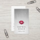 Le design élégant du carte de visite vertical pour les maquilleurs ou les professionnels de la beauté présente un lettrage noir classique sur un arrière - plan gris pâle et sombre, orné de fils de ficelle argentée. Personnalisez avec deux lignes de texte personnalisé sur le devant, sous une illustration vibrante d'impression à lèvres roses, et ajoutez vos coordonnées complètes à l'envers.