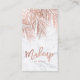 Un carte de visite moderne et élégant élégant de maquilleur avec la typographie élégante de style de lettrage de main de manuscrit avec le cadre rose d'or sur une feuille rose de palmier d'or de faux sur le marbre blanc