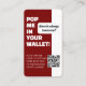 Faites partager vos souvenirs de votre journée spéciale sans effort et élégant avec notre carte de visite innovant qui vous permet de combiner élégance classique et technologie moderne. Le design comporte un texte "Pop Me In Your Wallet" en caractères gras, attirant l'attention tout en encourageant les clients à garder la carte à portée de main. Comprend un code QR important qui permet aux invités de télécharger facilement leurs meilleures photos directement sur un album en ligne partagé, créant une façon transparente de rassembler vos moments favoris.