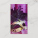 Cartes de visite avec une photo d'un masque pourpre de mascarade avec des plumes et des parties scintillantes.