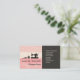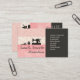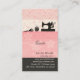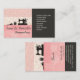 Une mignonne carte féminine professionnelle rose avec une ambiance rétro pour vos vêtements, couture et boutique de mode. Design classique sophistiqué avec mannequin vintage, machine à coudre vintage et pincushion contre un mur floral rose et sur le côté un arrière - plan noir avec texte blanc et icônes pour l'industrie de la couture et de la mode.