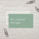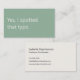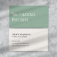 A modern, minimalist business card perfect for freelance proofreaders. The front features a soft green background with the apt phrase "Yes, I spotted that typo" in off-white text. The reverse has an off-white background with dark charcoal grey text and space for your contact details. All text on the card is fully editable.