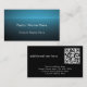 Easily customize this unique modern business card with your name and contact details and QR code for a great calling card. This black and blue business card with clear white script can be edited for your purposes. For the Christian Pastor, add your name and title and your place of worship. On the back is a place for more custom text and a QR code for easy access. You could add a tagline or Bible Scripture or hours of the worship service if desired. Also be sure to personalize the back with the church address, telephone number, email or website address. I created this unique design with a turquoise blue light burst on a black background. It looks cool and trendy and looks like a light breaking through the darkness. This would be a great card for a pastor, minister, counselor, or other church or spiritual or religious professionals.