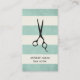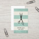 Modèle de carte de visite moderne entièrement personnalisable avec texture vert/vieux rayures blanches et icône ciseaux noirs. Parfait pour coiffeur, coiffeur.