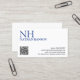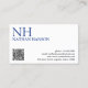 Cartes de visite QR Code moderne avec un design simple et minimal bleu et blanc avec votre monogramme en caractères gras avec votre nom dans le coin supérieur gauche. Vos coordonnées se trouvent dans le coin inférieur droit.