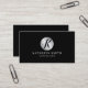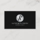 Un design élégant et moderne avec un monogramme de script noir en cercle argenté avec des informations d'affaires en argent style professionnel sur arrière - plan noir.