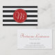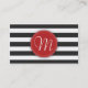 Ce carte de visite chic et chic comporte un arrière - plan rayé horizontal noir et blanc classique. Sur l'arrière - plan est un cercle décoratif rouge lumineux avec un monogramme blanc personnalisable. Le dos de la carte est blanc simple avec la pièce pour votre nom, fonction et détails de contact. C'est les cartes de visite idéaux pour des personnes de mise en réseau, des salons et des spas, des boutiques, des maquilleurs et des professionnels d'industrie de la mode.