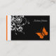 Carte de visite avec un design noir, blanc et orange frappant - avec un papillon orange contre un arrière - plan noir avec de jolis tourbillons floraux blancs. La carte a une ligne orange et blanche sur le côté. Le texte et les polices à l'avant et à l'arrière de la carte peuvent être facilement changés. Le texte est en blanc, mais il peut également être modifié pour refléter votre propre style. sgb01