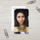 Carte de visite professionnel chic avec votre photo surplombée par une fausse bande métallique en or brossé et votre profession et votre nom dans la typographie moderne minimale. Au verso, personnalisez vos coordonnées et entrez votre adresse de site Web pour créer un code QR numérisable pour les clients et les clients afin d'accéder facilement à votre plate-forme en ligne.