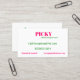 Carte de visite minimaliste moderne sur mesure pour les amoureux des animaux de compagnie, les chaises pour animaux de compagnie, les promeneurs à chiens. Avec une question ludique et captivante "Picky about your pet’s care?" dans un texte clair et éclatant de Kelly Green et Hot Pink pour attirer l’attention des clients potentiels. Customisez pour promouvoir votre style personnel ou votre image professionnelle grâce à l'outil de design facile de Zazzle. Vous pouvez modifier le style de la carte en fonction de vos préférences. Visitez notre magasin pour coordonner des cadeaux, des vêtements et du matériel promotionnel personnalisés.