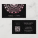 The top portion of the front side features a pink metallic intricate floral mandala on a black background. The bottom portion features a black text field with an elegant modern handwritten script. At the backside is a scannable qr code for your website. Perfect for salon, hair-and makeup, beauty, yoga teacher, boutique or any female entrepreneur.