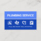 A blue shades layered cover is demarcated by a thin border line. Just below this is an array of plumbing icons alongside the contact details near the base of the card. Towards the top you have the business name "PLUMBING SERVICE" which you can change.