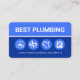 A blue shades layered cover is demarcated by a thin white border line. Just below this is an array of blue plumbing icons alongside the contact details near the base of the card. Towards the top you have the oversize business name "BEST PLUMBING" which you can change.