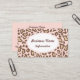 Un joli empreinte de léopard rose pastel orne ce carte de visite professionnel. Customisez ce carte de visite pour répondre à vos besoins. Changez le texte, la taille de police, etc...Le design est de l'art original. Utilisez ce carte de visite élégant pour une boulangerie, consultant, boutique, mode, vêtements, transformations, décoration, boutique, maquilleur, cosmétologue, confiserie, coiffeur, salon, spa, salon à ongles, décoration maison, design d'intérieur, musicien, etc...