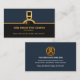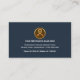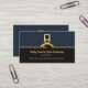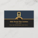 Un faux motif de chef en or délimite la couche supérieure bleu foncé contre une pièce noire en dessous. C'est ici que vous trouverez votre nom d'entreprise, le titre de votre emploi et les coordonnées de votre contact. Les lettres ici sont en faux or.