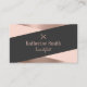 Elégant carte de visite de coiffure géométrique avec texture d'or noir, rose et faux rose, ciseaux et police de calligraphie moderne.