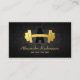 Élégant entraîneur de fitness cartes de visite avec un élégant hexagone noir arrière - plan avec une courbée or bodybuilder poids de gym, votre nom, titre, les coordonnées, et les icônes des médias sociaux.