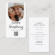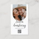 Des cartes de visite de photographie modernes et professionnels avec votre photo avec une typographie de script minimaliste à la mode en plus de votre code QR. Ajoutez vos coordonnées à l'arrière. Comprend trois icônes de médias sociaux et un champ pour votre nom d'utilisateur.