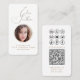 Ce design blanc simple et professionnel comprend une élégante typographie de script, une photo ronde (remplacez-la par une photo carré pour obtenir de meilleurs résultats), de nombreuses icônes de médias sociaux et un code QR à personnaliser avec votre site Web ou blog. Les icônes des médias sociaux peuvent être déplacées ou supprimées à l'aide de l'outil de conception.