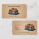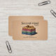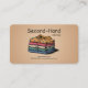 A vintage-style business card featuring a stack of neatly folded, colored clothes, including a floral print shirt representing a thrift store, all on a gradient beige background. Perfect for a second-hand or used clothes shop or business.