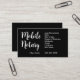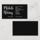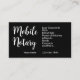 Mobile Notaire apparaît dans un grand script élégant. Vous pouvez ajouter votre nom sous le script. Les chiffres de votre numéro de téléphone sont sous la liste des services, qui est à côté du script. Le carte de visite est noir. Le texte est blanc. Tout le texte peut être modifié ou supprimé.