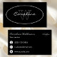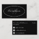 Un carte de visite dans un design simple et élégant en blanc sur noir avec un nom et monogramme dans un ovale sur l'avant et les coordonnées sur le dos.