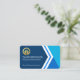 Cover features an arrows design that is accentuated by blue shaded trapezium layers. Card details are over on the left with a gold global logo you can use placed at the top. Just below this is your prestigious name and job title with the business name near the base.