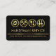 An all black cover is accentuated by a faux gold line near the base of the card. Over at the top are gold handyman tools logo which you can use. The tools can represent some of the services that you offer eg. The hand drills can be for carpentry, the hammer for home repairs, the brush-scrapper for painting an the trowel-fork for landscaping-gardening. Their usage is left to your own interpretation. Below the logo is the business name "HANDYMAN SERVICE" which you can change with the contact details near the base.