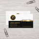 A retro white and black layer is demarcated by a faux gold stripe near the right side of the card. Riding this gold stripe of success is your business name with a creative gold "letter-e" logo you can use in the opposite direction. The letter-e can represent "electrician" or possibly your business name. The black layer below houses your prestigious name, job title and the contact details with a slogan caption in the opposite direction. Lettering here are in faux gold.
