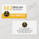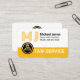 A white and yellow taxi colored layer design. At the top left corner is your yellow oversize name monogram alongside your prestigious name and contact details. Towards the base, riding on the yellow layer is a gold chauffeur logo you can use with the business name "TAXI SERVICE"; Please change the caption to suit your own service needs.