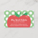 Carte De Visite Teacher Tutor Cute Apple & Worm Pois Vert