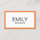 Design présenté dans le carnet de vacances de Zazzle! La typographie noire chic et minimaliste sur arrière - plan blanc avec cadre mince orange donne une touche classique mais moderne à ce modèle design carte de visite. Customisez avec votre nom et votre titre à l'avant et vos coordonnées et logo à l'arrière. Matériel marketing correspondant disponible dans Small Business Tools Collection © MARISU PAPER CO