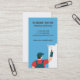 Illustration d'un peintre en dessus rouge et en bleu denim peignant du bleu sur le mur avec une brosse à rouleaux. Idéal pour ceux qui proposent des services de peinture ! Personnalisez facilement vos informations professionnelles dans les modèles de texte fournis. Carte de visite en alignement vertical. L'alignement horizontal est également disponible.